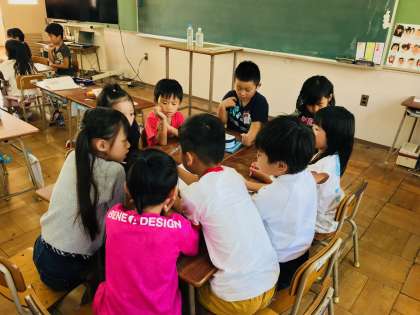 算数の授業で、違う形の容器に入った水の量をどちらが多いか調べる学習をしました。今日は、グループで調べ方について話し合いました。