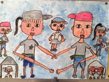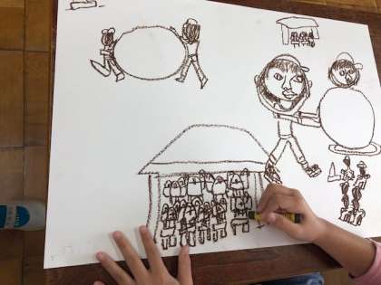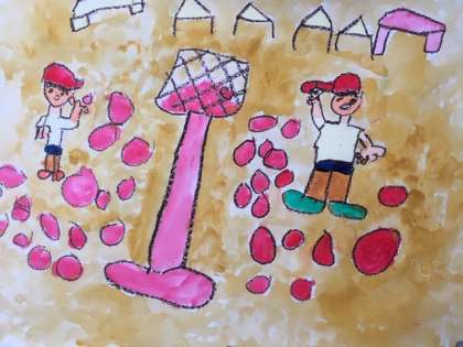 初めに、茶色や焦げ茶色のパスで、運動会の「大玉ころがし、玉入れ、ダンス」と、楽しかった思い出を白い画用紙に大きく描きました。
