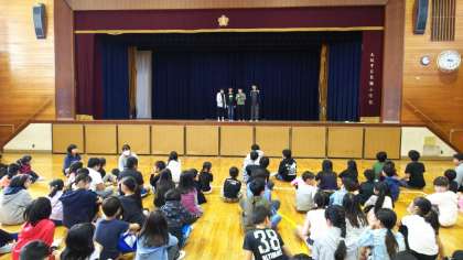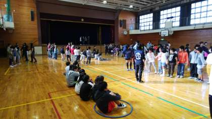 今日の児童集会では、たてわり班で1列に手をつないで並び、