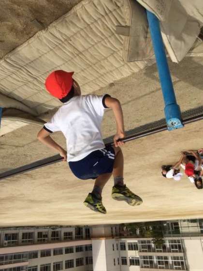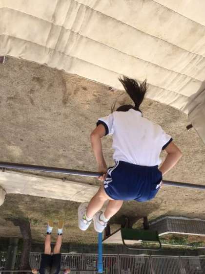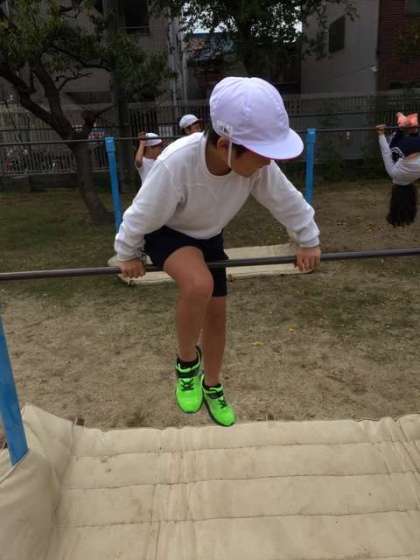 跳び上がりや跳び下り、逆さにぶら下がってみたり、くるっと回転してみたり、色んな技に挑戦しています。