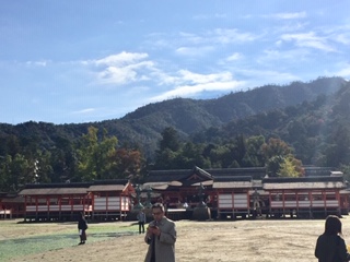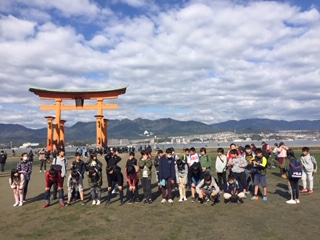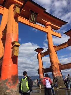宮島に到着し、厳島神社の大鳥居で記念撮影しました。お天気も良く、海も穏やかで、大鳥居の真下まで行くことができました。