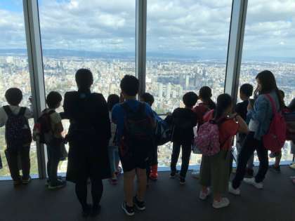 今日は社会のまとめ学習で大阪環状線一周とあべのハルカス展望台から大阪の様子をみました。お昼はてんしば公園でお弁当をみんなで食べました。
