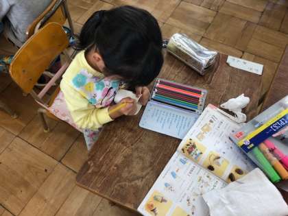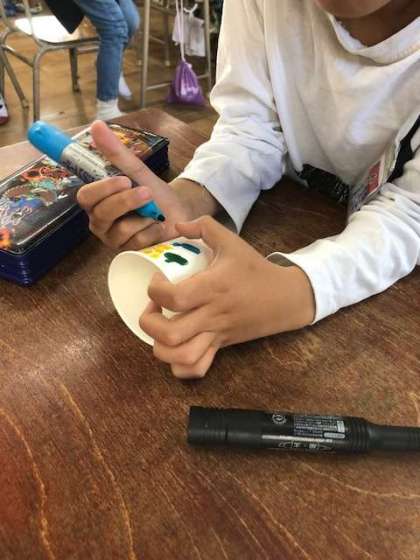 生活科の時間にマラカスをつくっています。紙コップに絵を描きました。「これは空!」と星を描いたり、自分の好きな動物を描いたり、色々な絵を描いていました。この後どんぐりを入れて、かわいいマラカスを完成させていきます。