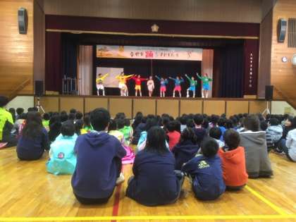 11月21日の午後からは韓国からこられた小学生のダンスチーム「SAFARI」の公演を全学年の児童で鑑賞しました。