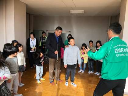 今日は「目が見えないことを考えよう」の学習でアイマスク体験をしました。ゲストティーチャーにはパラリンピックで大活躍の方にきてもらい、障がい者にたいする理解が深まりました。