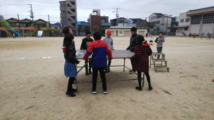 集会が始まる前に力を合わせて朝礼台を動かしていました。