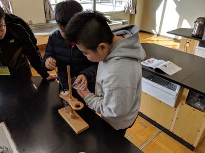 理科の「もののとけ方」の実験。食塩やミョウバンを溶かした水溶液を、氷水で冷やしたり蒸発させたり。2つの方法でとかしたものの行方をさがしました。手順をしっかり確認しながら実験することができていました。