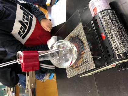 各班のみんなで協力して、丸底フラスコの中の水の様子と温度計の温度を観察していました。
