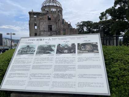 原爆ドーム前で、原爆が落とされた時刻8時15分に流れる平和の鐘の音を聞きました。