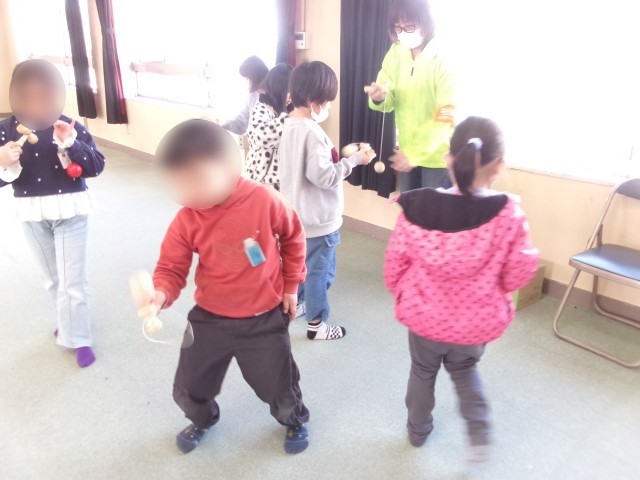 子どもたちは、けん玉・お手玉・カルタ・だるま落としといった昔から親しまれてきた遊びを、地域の方に教えてもらいながら楽しんでいました!