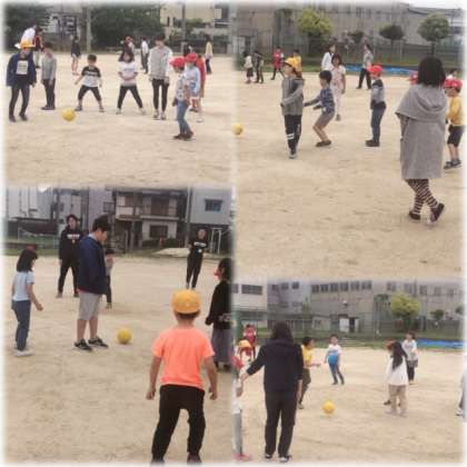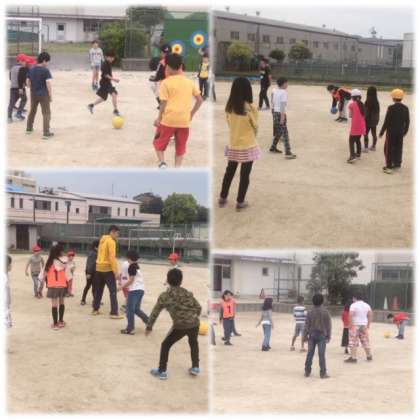 「今日の集会は、ニコニコ班(縦割り班)で転がしドッジボールをします。」