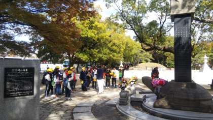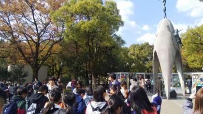 平和記念公園を資料館に向かって移動します。公園内にある記念碑で戦争で苦しんだ人々への思いを馳せ、平和であることのありがたさを感じてもらいたいです。
