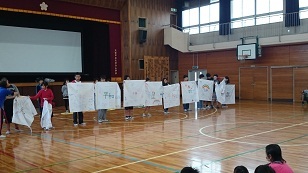 まず、みんなからの平和メッセージが書かれた旗や、亀のレリーフが6年生に託され、学校や保育所のみんなが作った平和への祈りが込められた千羽鶴が披露されました。