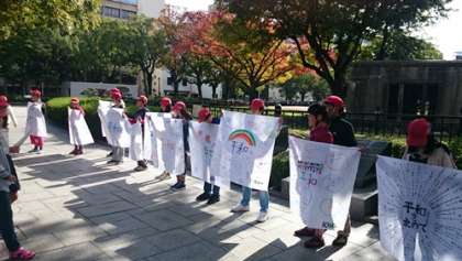 原爆ドーム前、原爆の子の像、韓国人慰霊碑で平和集会を行いました。