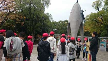 原爆ドーム前では、平和への願いをこめて黙祷し、みんなが心をこめて作った旗を捧げてきました。