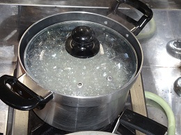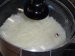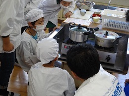 まずは、ごはんの炊き方を学習しました。お米の洗い方、とぎ方をうかがい、そのときの水も大切にすることを知りました。今回は、鍋を使って炊きました。時計係の人が時間を計り、コンロの火加減を調節しました。