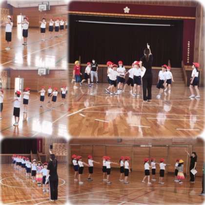 1列から2列に並びかえたり、バラバラに広がった状態から先生のもとに整列したりしました。