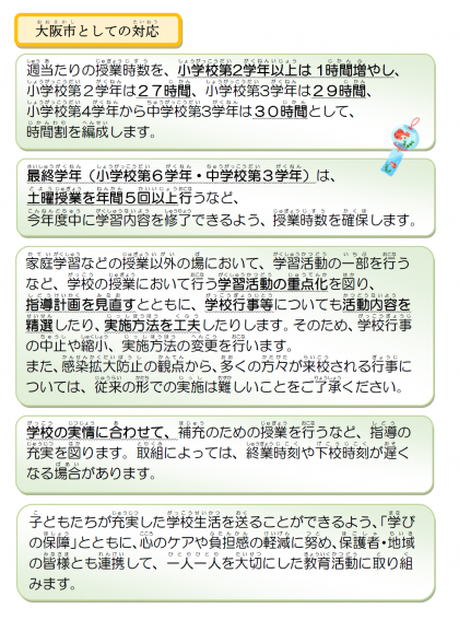 感染拡大防止や熱中症等の健康対策を講じたうえで、学びの保障を行っていきますので、ご理解・ご協力のほど、よろしくお願いします。