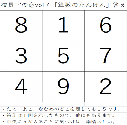 前回の校長室の窓vol7「算数の探検をしよう」の答えを掲載します。お子さんと一緒に考えていただいた保護者の皆様、ありがとうございました。