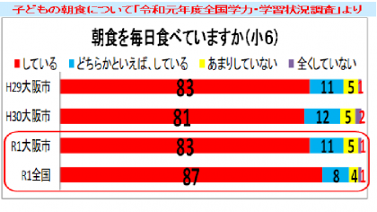 さて、今回の校長室の窓vol8のテーマは「朝食」です。上図は、昨年度の全国学力・学習状況調査のデータです。大阪市の6年生の児童の6人に1人が、毎日、朝食をとっていないという結果が出ています。皆さんのご家庭では、毎日、子どもたちは、朝食をとっていると思います。時々、子どもたちが朝寝坊して、時間がなくてということもあるかもしれませんね。