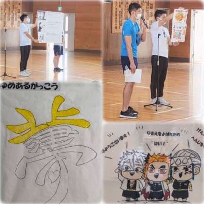 終業式では、校長先生や生活指導担当の先生から「楽しい夏休みをすごすためのやくそく」をしました。また、先日から取り組んできた、「元気よくあいさつをしよう」「はいと返事をしよう」の目標が達成できた日にシールを貼る「夢(北津守)」文字が少しずつ完成してきたこと、あいさつや返事ができるようになってきたことのお話を聞きました。
