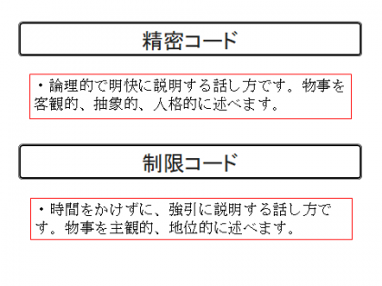 言葉の説明は、上図に書いている通りです。学校で、先生方は「精密コード」を使って授業をしています。「制限コード」を使っていては、子どもたちに先生の話している内容が伝わらないですから、当然と言えば当然です。