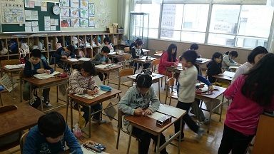 4年生も、算数のプリントに取り組んでいました。答えにあまりのあるわり算の筆算などに、一人一人が真剣に取り組み、こちらも、自分のファイルにきちんと綴じていました。
