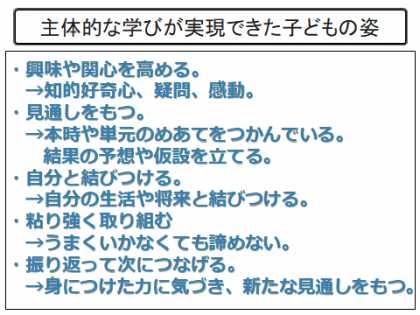 上図をご覧ください。主体的な学びが実現したときの子どもの姿を例示しています。学習する内容に興味や関心をもち、学習のめあてをつかみます。学習した内容を自分の生活と結びつけ、粘り強く取り組み、新たな力を身につけて、次の学びに活かします。