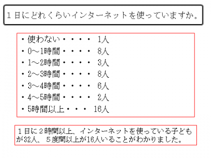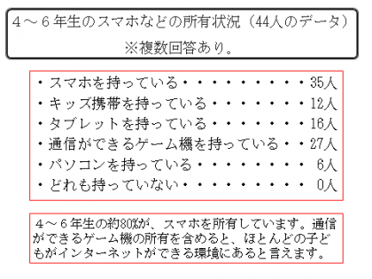 今回の校長室の窓は、高学年のスマホアンケートの結果についての考察です。高学年になると、スマホの所有率は高くなり、約80%になります。1日にどれくらいインターネットを使っているかについても、長時間使用している実態がわかりました。