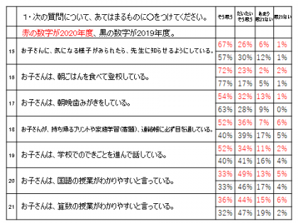 上図は今年度と昨年度の学校教育アンケートの比較表です。質問項目の15〜28について掲載しています。質問項目29は、今年度からの項目なので比較していません。