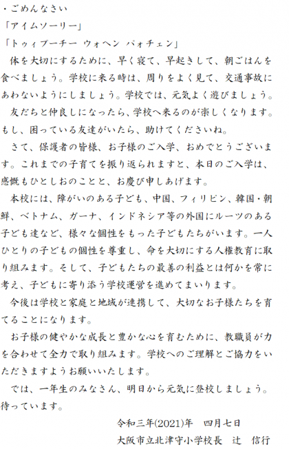 今回の校長室の窓は、第96回北津守小学校入学式で、私がお話をした式辞をご紹介します。合わせて、本校ホームページの左上にある「学校概要」⇒「校長あいさつ」もご覧いただけると嬉しいです。よろしくお願いします。