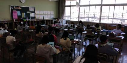 もう一枚の写真は、今日のタブレットパソコンを使っての学習の様子です。新型コロナウイルス感染症が拡がりを見せています。今後、実施されるかもしれないオンライン学習に向けて「teams」にというネット上の学級に入る練習をしていました。うまく「teams」に入れない児童に優しく教えている姿が見られました。6年生のみんなは、ほんとに優しいなと感じた瞬間でした。