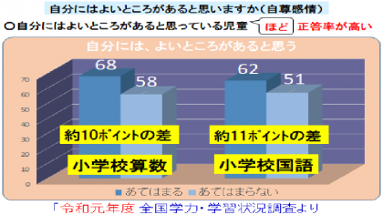 児童の自尊感情と学力との間には、相関関係があることがわかっています。児童の自尊感情が高いほど学力は高くなる傾向にあります。逆に言うと、学力が高い児童ほど、自尊感情が高い傾向にあるとも言えます。(下図の表を参照してください。)