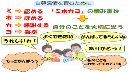 本校では、児童の自尊感情を高めるために、教職員で共通理解し、児童のことを「認める」「褒める」ことを大事にしています。また、教職員自身が児童の頑張る姿を見て「感謝する」「喜ぶ」ことも意識しています。「ミホ・カヨ」の取組(下図参照)は、ご家庭でも行うことができます。ぜひ、保護者の皆様も実践してみてください。