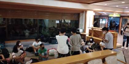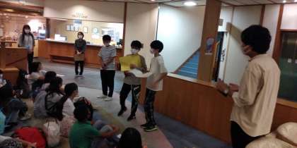 宿舎に到着し、入所式をしています。全員元気です。この後は、待ちに待った夕食です。そして、休憩後、入浴、今日の振り返りを行い、22時には就寝予定です。