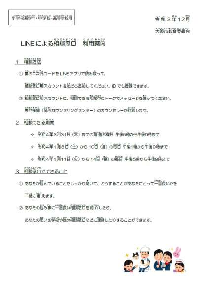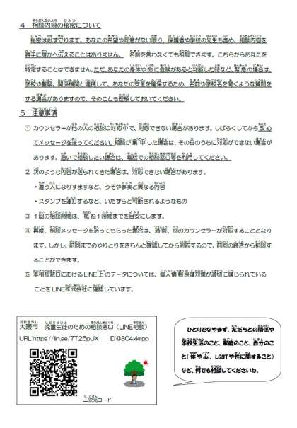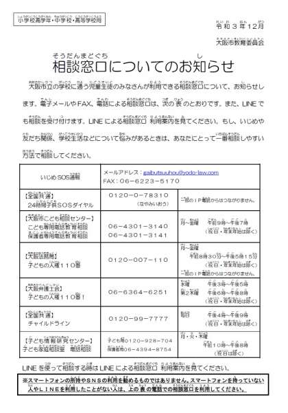 明日から、長い冬休みです。もし、お子様が友だちのことで悩んだり、自分のことで不安になったりしている様子を見られたときは、下記の相談窓口を教えていただくことも可能です。本日、子どもたちには、担任より同じ内容の手紙を配っています。終業式でも、話をしていますので、子どもたちもわかっていると思います。