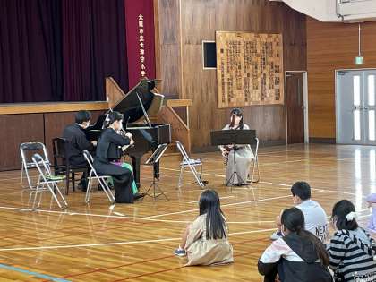 今日は「大阪フィルハーモニー交響楽団」に出前授業として来ていただき、目の前でいろんな曲を演奏をしていただきました。楽器は「ピアノ」「バイオリン」「ファゴット」。奏でられる音程の違いや楽器の作りの説明、曲の解説などをわかりやすくしていただきました。知っている曲でも音色によって聞こえ方が違って楽しむことができました!