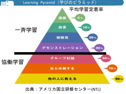 上図は、アメリカ国立研修センターが示した「学びのピラミッド」と言われるものです。先生の話を聞いている講義型の授業の学習定着率は5%、視聴覚教材を使った授業の学習定着率は20%です。