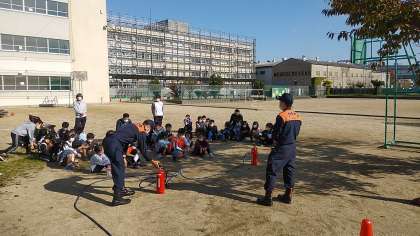 1は西成区役所の防災担当との方と連携しました。2は西成消防署の協力を得て実施しました。保護者の皆様にも参観いただき、ありがとうございました。今後も、地域の様々な施設と協力しながら、学校が地域防災の拠点となるよう、防災教育を進めてまいります。