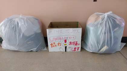 上の2枚の写真が、児童会の子どもたちが各教室でアピールしている様子です。一番下の写真は、プロジェクトの結果、ご家庭から集まった服です。予想をはるかに上回る服が集まりました。鶴見橋中学校生徒会の皆さんが用意してくれた回収ボックスには入りきれませんでした。多くの子どもたち、保護者の皆様のご協力に感謝申しあげます。ありがとうございました。