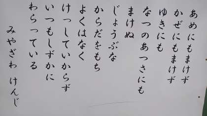 2年生の子どもたちが、同じ時期に、宮沢賢治さんの詩である「雨ニモマケズ」の暗唱をしていました。時々、正門入り口に立ち止まって、詩を口ずさんでいる子どもたちを見かけます。学校生活のあらゆる場面で、言葉を覚えたり、詩を暗唱したりしながら、学びを深めていくことが大切なのです。