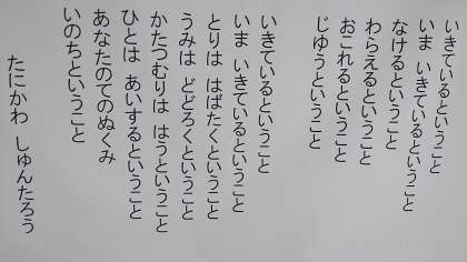 土曜参観でお気づきの方もおられたと思いますが、正門入口の掲示板に、宮沢賢治さんと谷川俊太郎さんの詩を掲示していました。