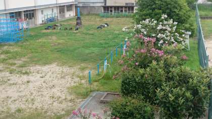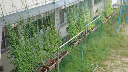 静かな運動場は、間もなく訪れる子どもたちの歓声を待っているようです。今年も、緑のカーテンとしてゴーヤを植えました。ただ、少し植えたのが遅くなってしまったので、生育が十分ではありません。引き続き、残暑のもとで、大きくなってくれることを期待しています。