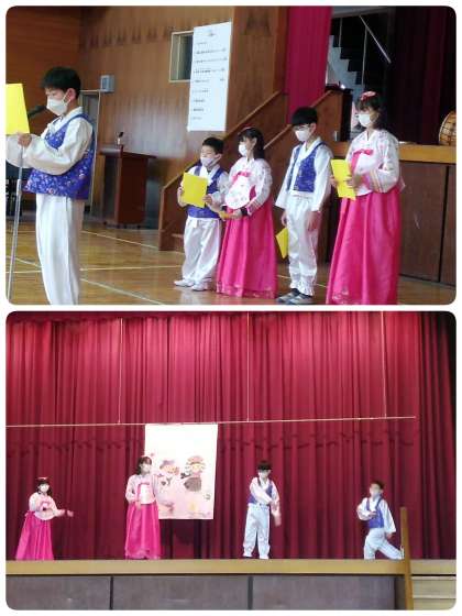 写真中は「民族学級」。自分の想いを語るスピーチ、楽器演奏(サムルノリ)、韓国のKポップダンスを発表しました。