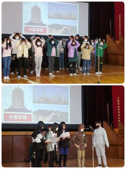 写真下は「中国学級」。みんなで中国の歌を歌い、歌に合わせた振り付けも披露してくれました。6年生の児童は、漢詩「春眠不覚暁」を朗読しました。