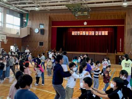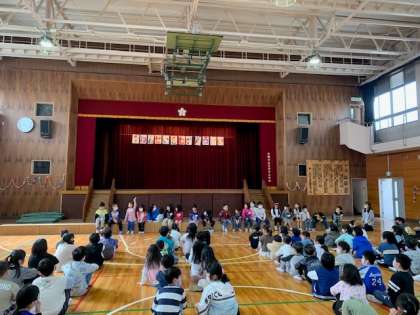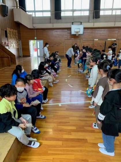 1年生の入学を、全学年でお祝いしました。1年生の紹介では、運営委員会の子どもが、1年生一人一人の名前を呼び返事をしてもらうようにしました。校歌を歌ったり、「じゃんけん列車」ゲームをしたりして楽しく過ごしました。