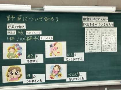 野菜には「体の調子を整える働き」があることを知り、給食の献立(ビーフカレーライスとグリーンサラダ)では何グラムの野菜を食べているか計算しました。学習の終わりには、今後の野菜の食べ方について、自分の考えをまとめました。