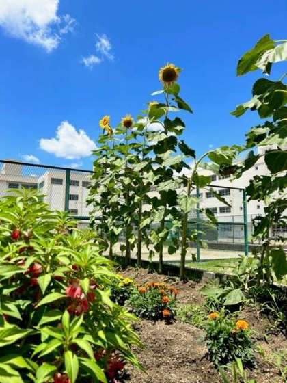 1学期最後の理科の時間、みんなで学習園に行ってみると、赤やピンクの花をびっしり咲かせたホウセンカ、3メートル近くに育ったヒマワリ、オレンジ色の花を元気に咲かせたマリーゴールドの姿がありました。