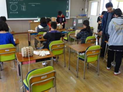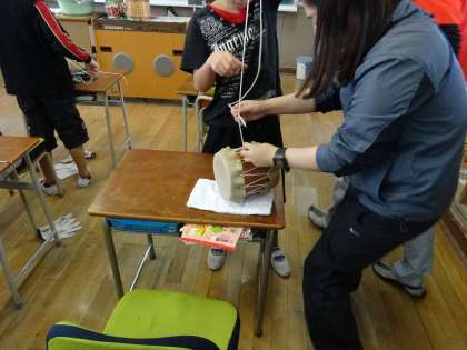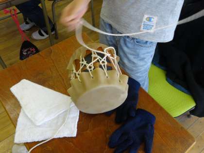 6年生は、私たちの生活と深く結びついている牛について学習し、創立90周年記念式典と並行して、先日まで開催されていた本校の「作品展」に出展するために、牛の皮を使った自分だけの「太鼓」を作りました。皮を締めるところで苦労していましたが、一人一人音の響きがちがう「太鼓」が完成しました。