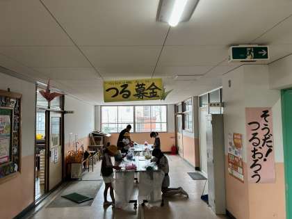2歳のときに被爆した佐々木 禎子さんが、12歳で白血病を発症し、折り紙で千羽鶴を折れば元気になると信じて鶴を折り続けたという動画を見ました。広島平和記念公園にある『原爆の子の像』のモデルとなっています。その後、ニコニコ班で平和の気持ちをこめてみんなで鶴を折りました。できあがった折り鶴は6年生が修学旅行で持っていき慰霊碑にたむけます。折り鶴の数がまだまだ足りないので、今日から職員室横に「つる募金」コーナーを設けて、休み時間などにも折れるようにしています。
